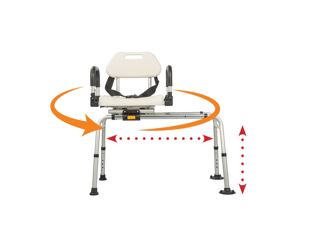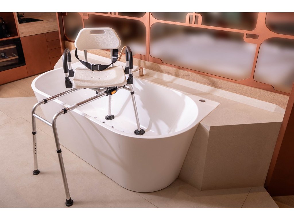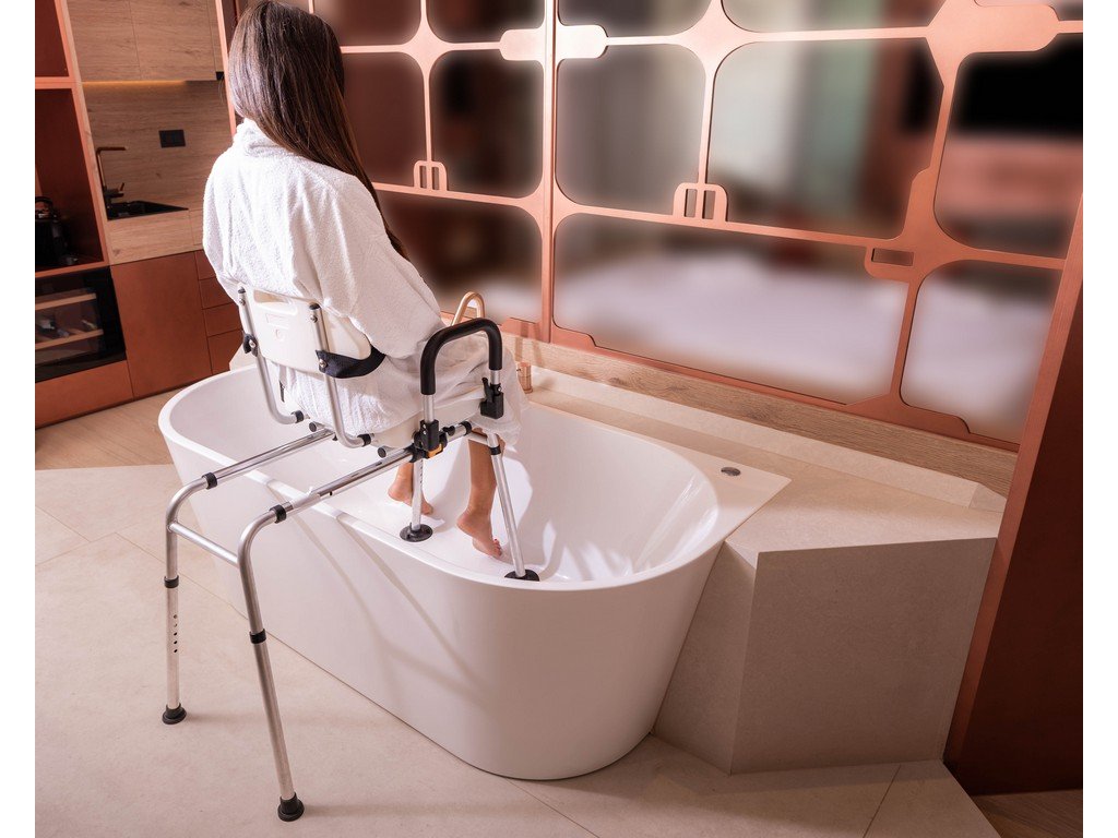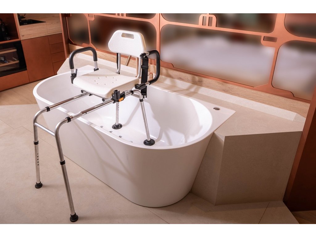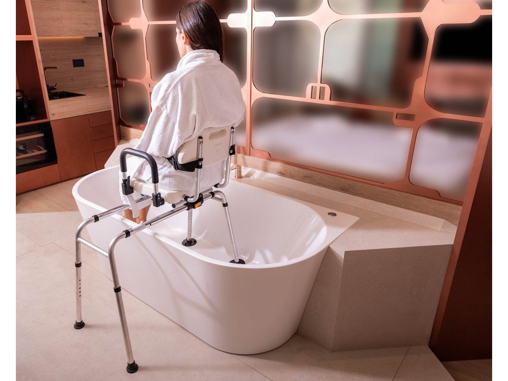 - Plná rotácia 360°: Sedadlo sa otáča okolo svojej osi, čo umožňuje ľahké nasadanie z vonkajšej strany vane a následné plynulé otočenie do bezpečnej polohy.