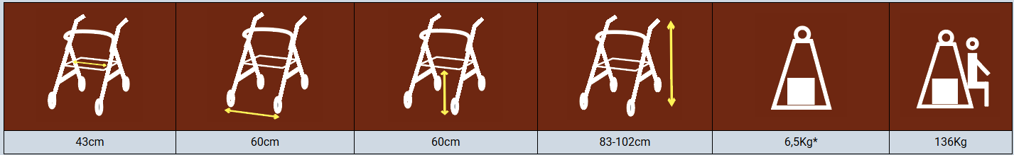 Obľúbená moderná skladacia štvorkolka (chodítko) vyniká svojim pevnejším vzhľadom a nízkou váhou. Predné kolesá sú otočné a zadné smerové kolesá sú s brzdou. Rám je z lakovaného hliníka, rukoväte sú výškovo nastaviteľné. Chodítko je vybavené sedadlom zo sieťoviny, s držiakom na palice, s polstrovaným zadným popruhom pre oporu chrbta a odnímateľnou látkovou nákupnou taškou. Zabrzdenie chodítka sa nachádza na rukovätiach.