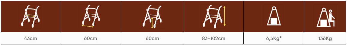 Obľúbená moderná skladacia štvorkolka (chodítko) vyniká svojim pevnejším vzhľadom a nízkou váhou. Predné kolesá sú otočné a zadné smerové kolesá sú s brzdou. Rám je z lakovaného hliníka, rukoväte sú výškovo nastaviteľné. Chodítko je vybavené sedadlom zo sieťoviny, s držiakom na palice, s polstrovaným zadným popruhom pre oporu chrbta a odnímateľnou látkovou nákupnou taškou. Zabrzdenie chodítka sa nachádza na rukovätiach.
