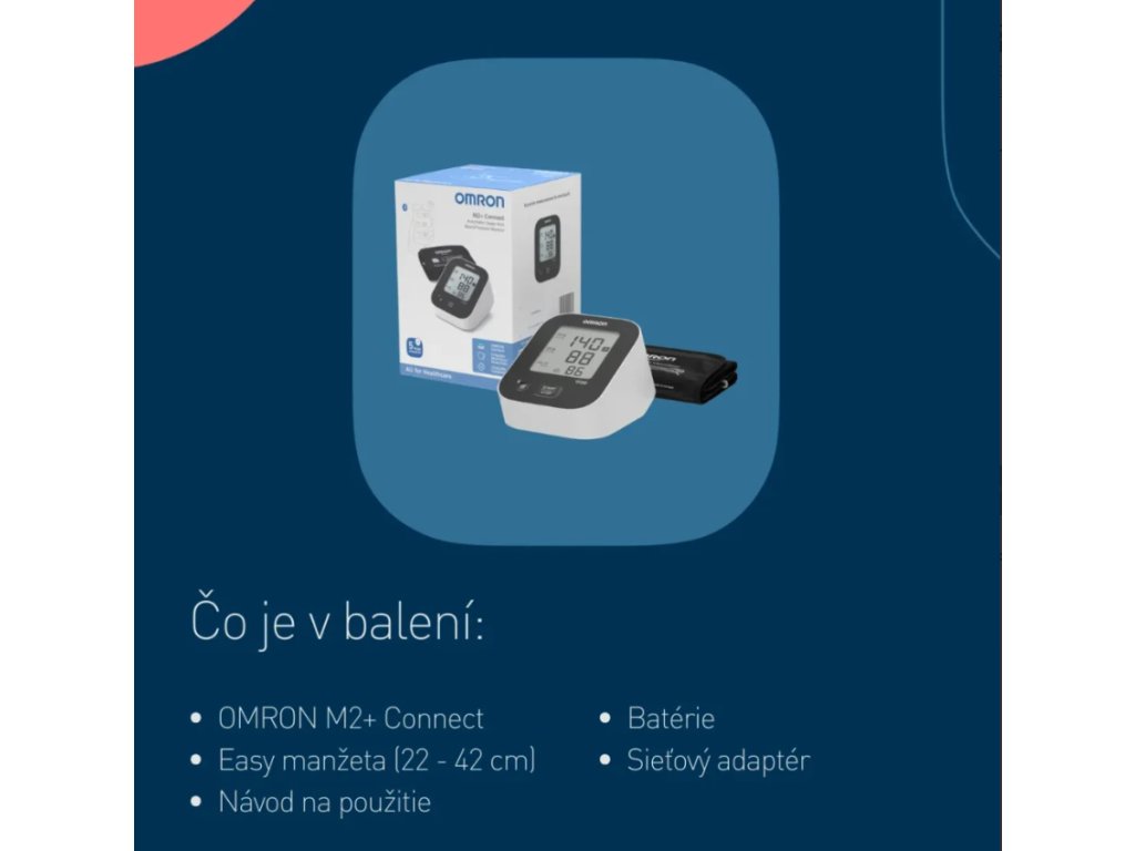 Obsah balenia: Tlakomer OMRON M2+ Connect, predĺženú OMRON Easy manžetu RML31 (pre obvod paže 22 – 42 cm), 4 batérie AA, návod, adaptér OMRON