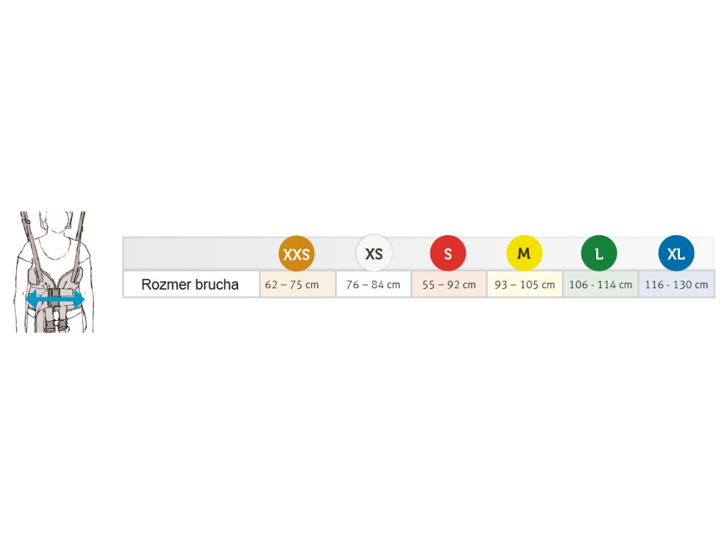 Vak umožňuje rôzne možnosti nastavenia. Je možné upraviť veľkosť vaku v oblasti brucha, dĺžku nožných popruhov a ramenných popruhov.